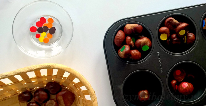 Oznaczone kasztany, dziecko może ułożyć w odpowiednich miejscach w formie na muffiny, przekładając je za pomocą rąk.