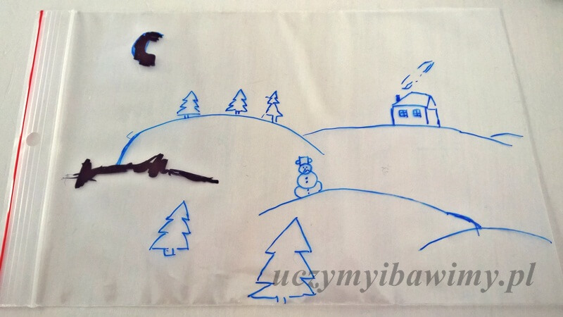 Pokryszliśmy styropian. Narysowaliśmy na woreczku strunowym zimowy obraz. Woreczek uzupełniliśmy styropianem i włożyliśmy słomkę. Zamieć śnieżna gotowa!
