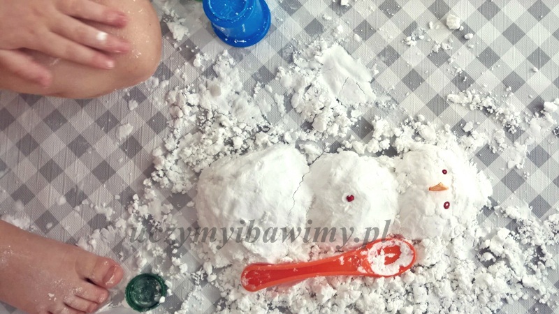 Z domowych mas całkiem niedawno robiłyśmy piasek księżycowy. Pamiętacie? Piasek swobodnie leży w odkrytym pudełku do dzisiaj (choć powoli przydałaby się zmiana;) i nie zmienił konsystencji. Domowy śnieg również w odkrytym pudełku, po nocy leżakowania był „mączysty”. Aby nadawał się do zabawy musiałam dodać pianki do golenia.