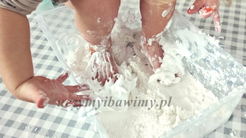 Zabawa jest naprawdę brudząca o czym przekonacie się sami, jeżeli tylko obejrzyjcie nasze zdjęcia dalej:) Zwłaszcza w naszym wykonaniu! Jeżeli macie opory możecie dziecko z masą włożyć do wanny/wanienki albo poczekać na lato 😉 Sposobem jest też wyłożenie pokoju ceratą lub folią malarską.