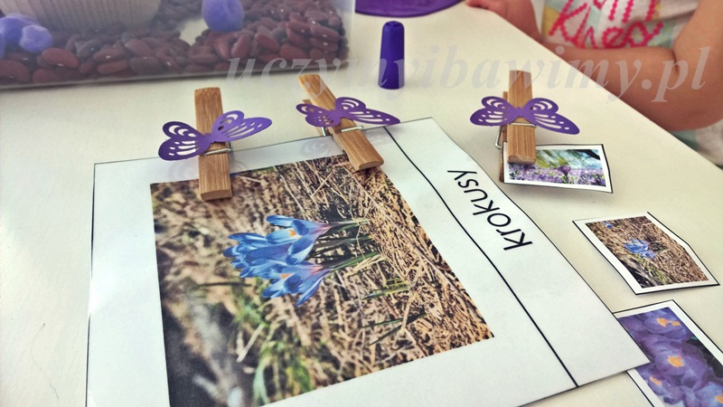 Na krokusy przyleciały motyle. Otwieranie i zamykanie klamerek do bielizny to dość trudna praca dla małych paluszków. Trzeba sporej siły. Możliwe, że na początku będziecie musieli poszukać „lżej” chodzących spinaczy.