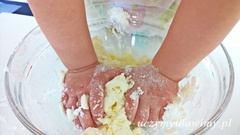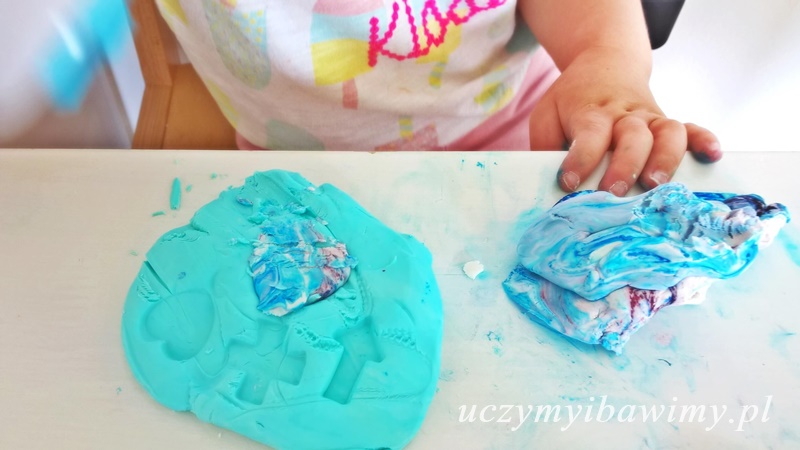 Barwienie masy. Zakładanie rękawiczek. Świetne ćwiczenie uświadamiające dziecku czucie ciała, palcy. A jaka koncentracja! Który palec, do której dziurki? 🙂