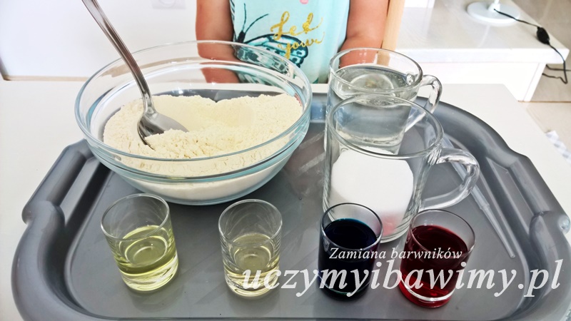 Na prawo zobaczysz w kieliszkach dwa barwniki: niebieski i czerwony (2 krople barwnika do jajek rozpuszczone w wodzie). Ostatecznie do masy dodałyśmy sam barwnik – 2 krople, ponieważ masa wyszłaby zbyt rzadka, a kolor mało intensywny.