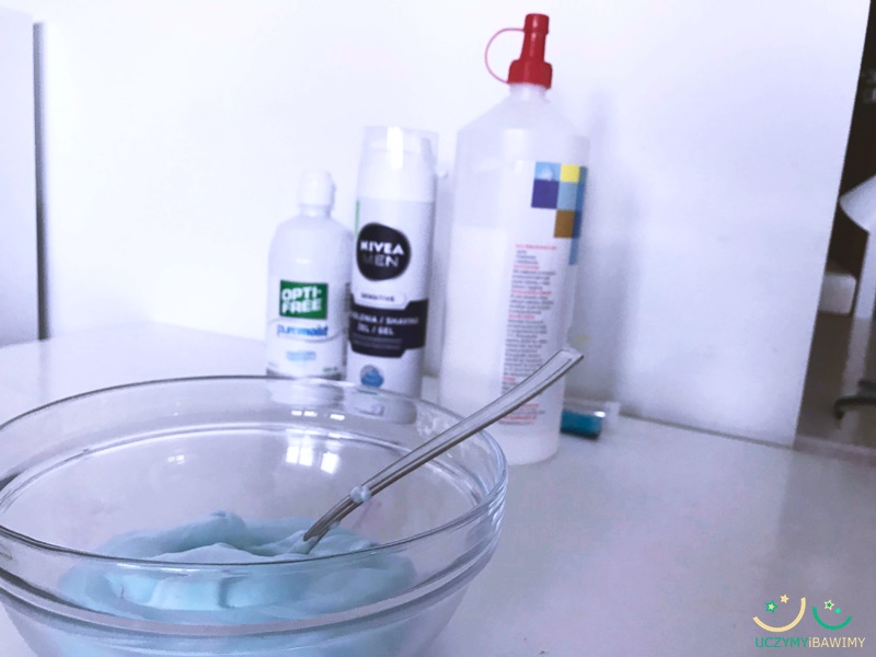Dodałyśmy identyczną ilość żelu do golenia i kleju. Odrobinę barwnika. Wymieszałyśmy i dodałyśmy płynu do soczewek. Ciężko powiedzieć ile, dodawałyśmy systematycznie po kilka kropel, tak aby masa zaczęła odchodzić od miseczki.