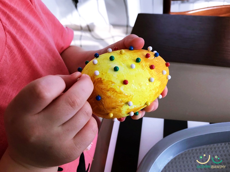 Wielkanocne jajka w trochę innej odsłonie niż pisanki, ale jak najbardziej zdobione. Mogą być dekoracją w domu. Usprawniają małe rączki, powodują radość i przygotowują do świąt. Nie napiszę dla jakiego wieku, bo sami najlepiej znacie własne dzieci i wiecie czy to już, czy jeszcze nie czas na takie aktywności.