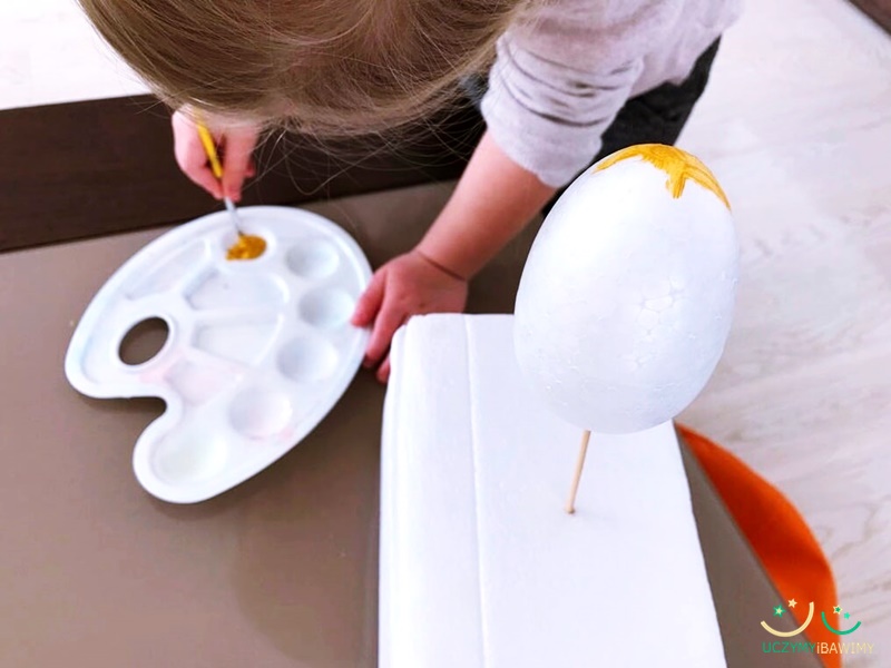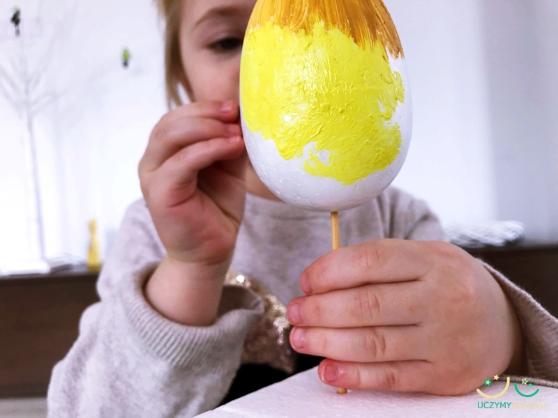 Wbiłam wykałaczkę w jajo, następnie w kawałek styropianu (można też trzymać w dłoni). Zuzia pomalowała jajo na wybrane kolory.